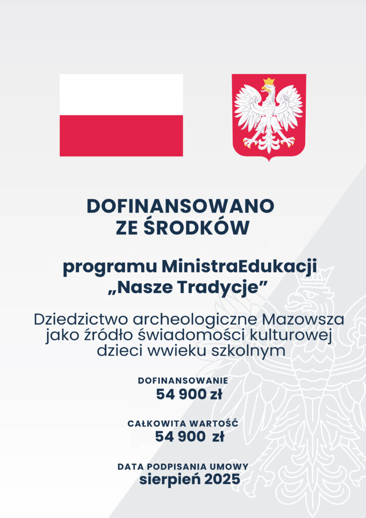 Zajęcia finansowane są ze środków programu Ministerstwa Edukacji Narodowej pn. „Nasze tradycje”. Moduł: Edukacja i świadomość kulturalna, w ramach realizacji projektu pt. „Dziedzictwo archeologiczne Mazowsza jako źródło świadomości kulturowej dzieci w wieku szkolnym” (numer wniosku NT/2025/281)